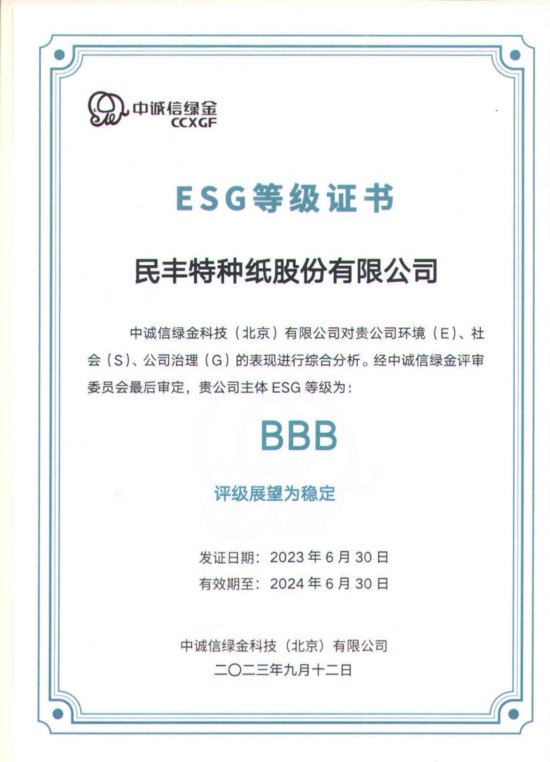 近日,公司收到中国第一、全球第四大评级机构——中诚信旗下中诚信绿金颁发的ESG登记证书。经中诚信绿金评审委员会最后审定,民丰特纸主体ESG等级为:BBB(位于行业22/156水平,可持续发展潜力较大),评级展望为稳定,在环境纬度中并列行业第一名。